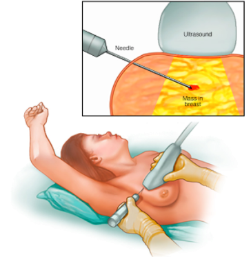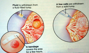A syringe and thin needle is used to draw the fluid or cellular material from the breast lump . FNAC only examined the cells (cytology) and does not allow for more accurate diagnosis. It is painless with local anaesthesia and the accuracy of the report is minimal