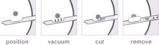This is suitable for small benign lumps that can be removed via a “key hole” incision without going through an open incision scar. A small hollow probe is inserted into the breast and the lump is removed in small strips of tissue using a vacuum and rotating blade until the whole lump is removed entirely.