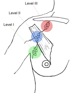 - Level 1 – the lowest level, below the lower edge of the pectoralis minor muscle.