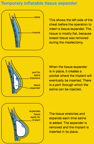 After mastectomy, if there is not enough room to fit an implant of the desired size, then a temporary inflatable tissue expander will be inserted first to gradually stretch the skin over time. The tissue expander is like a balloon bag that is injected with saline over time to slowly stretch the skin to the desireed size before an actualy silicone implant is inserted.