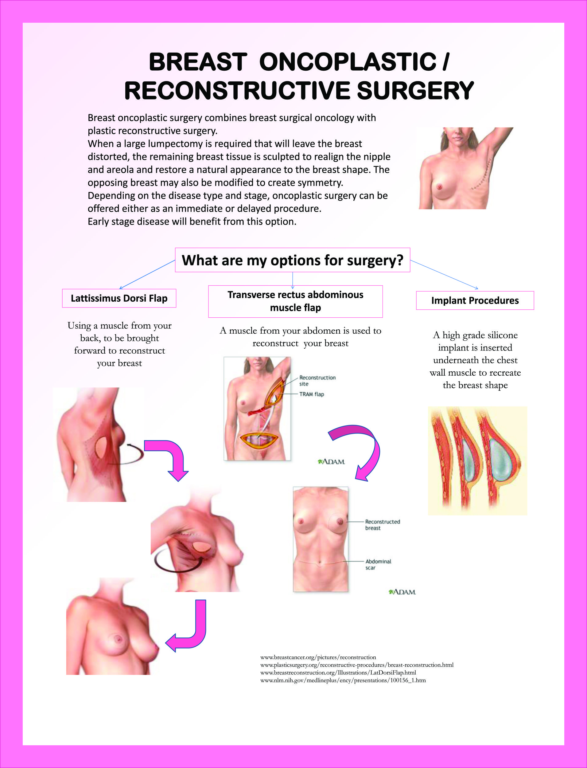 There are many options for breast reconstruction following surgery for breast tumour. As such, these options have to be discussed with the patients and the most appropriate option is then chosen and tailored for them. Many factors need to be taken into consideration during the discussion as these factors would affect not only the outcome of the reconstruction, but also the adjuvant therapies (radiotherapy and chemotherapy).