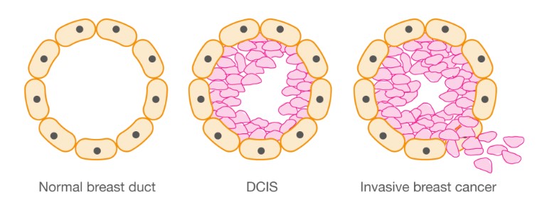 It is invasive when the cancer cells broke through the wall of the duct and invade and spread to the surrounding breast tissue. Once the cancer cells invade through the duct walls, it can spread to other organs and nodes via the blood vessels and lymphatic system.