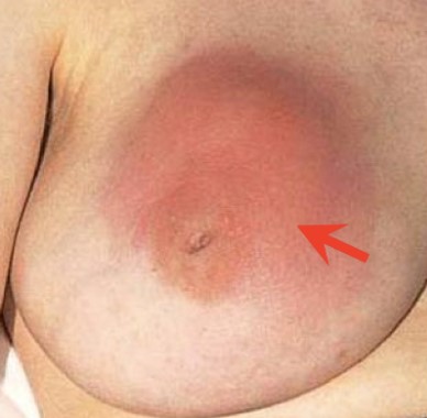 It usually presents with reddening and generalized inflammatory swelling of the breast and can mimic the presentation of a breast infection or mastitis.