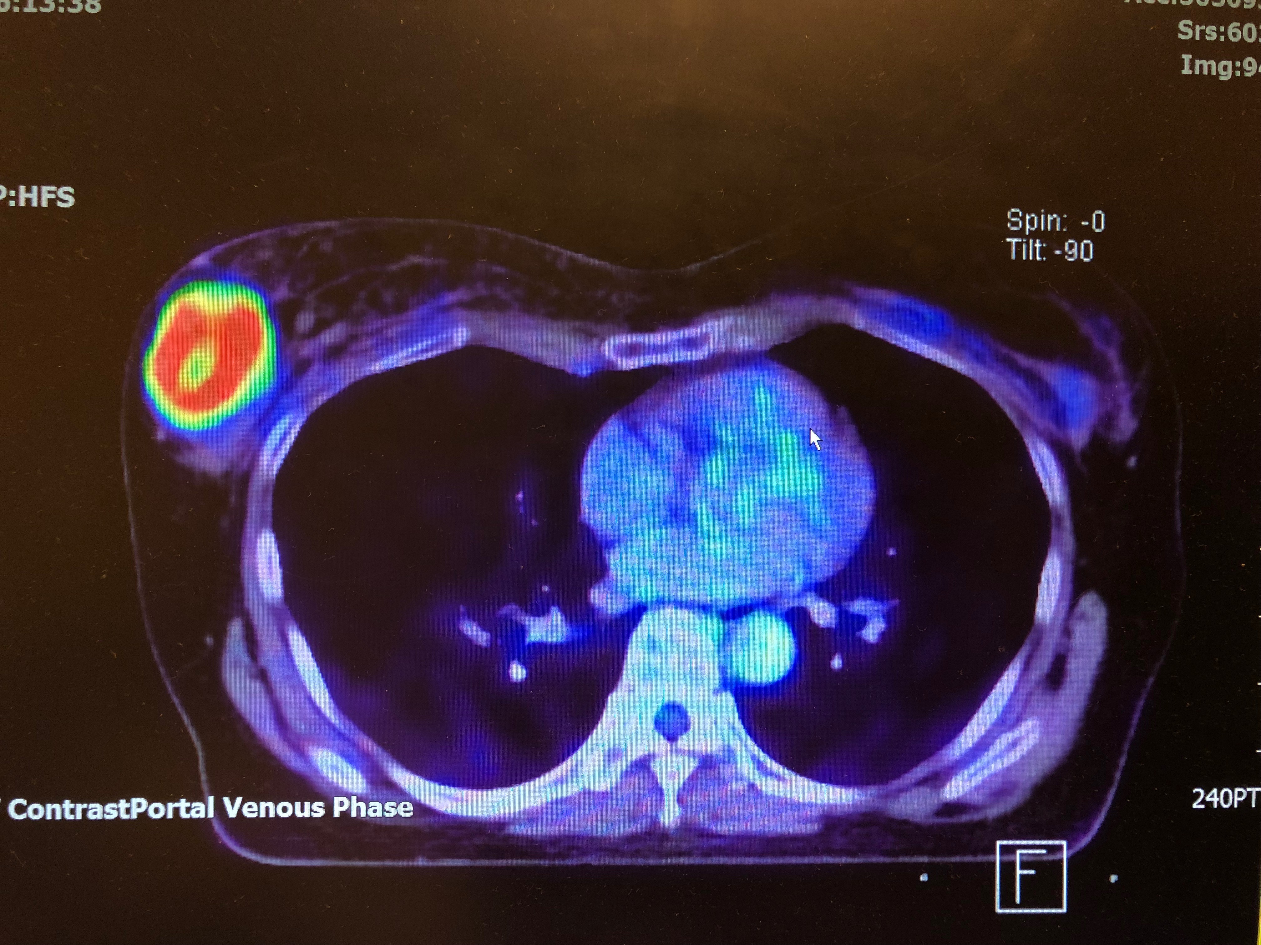 It is a computed scan using radiation contrast to take detailed pictures of the whole body from head to pelvis. A whole body scan is recommended as breast cancer can spread commonly to the brain, lung, liver, bone and adrenal gland.
