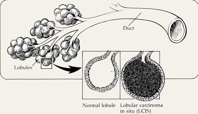 The cancer cells arises from the lobules of the breast ie which is the milk-producing glands ar the end of the breast ducts. In-situ means that the abnormal growth remains inside the lobule and does not spread to the surrounding breast tissues.